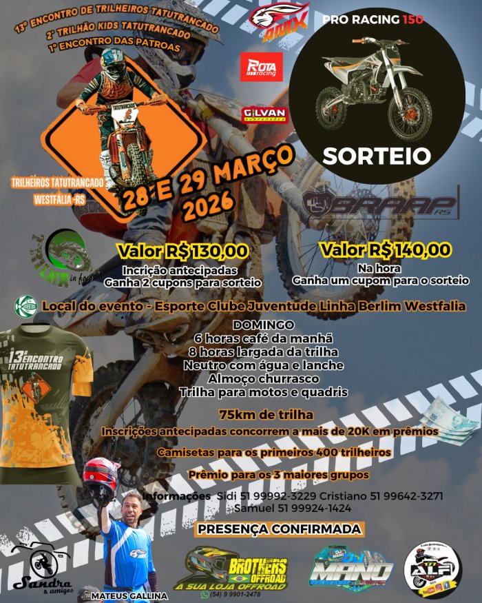 SORTEIO DE UMA MOTO PRO RACING 150 - CAMISETA PARA OS PRIMEIROS 400 INSCRITOS - SORTEIO DE 20 MIL EM PRÊMIOS SOMENTE PARA AS ANTECIPADAS - PREMIAÇÃO PARA OS 03 MAIORES GRUPOS - CAFÉ DA MANHÃ - 75 KM DE TRILHAS - LARGADA ÀS 08 HORAS - TRILHA PARA MOTOS E QUADRICICLOS - ÁGUA E LANCHE NO NEUTRO - ALMOÇO COM CHURRASCO