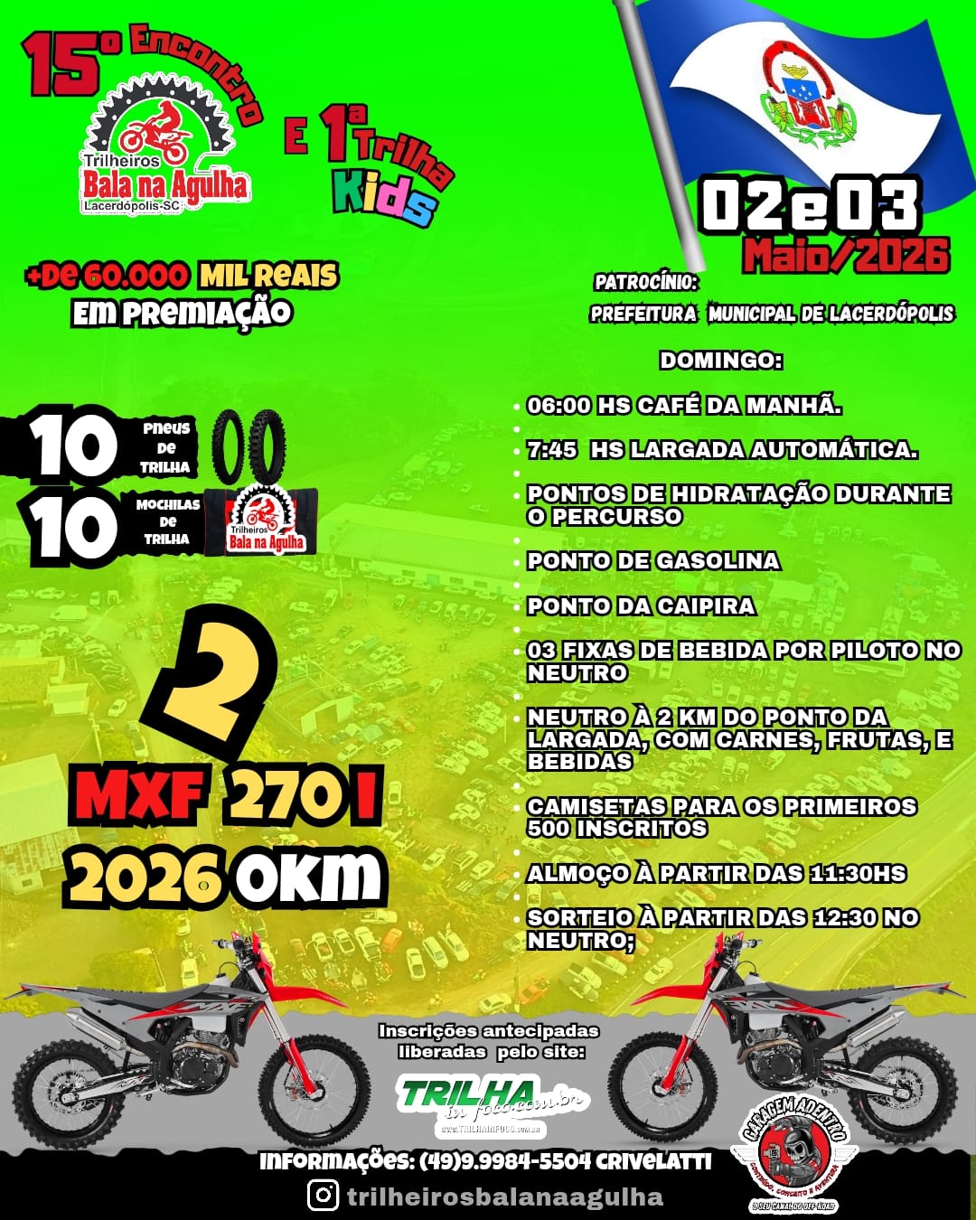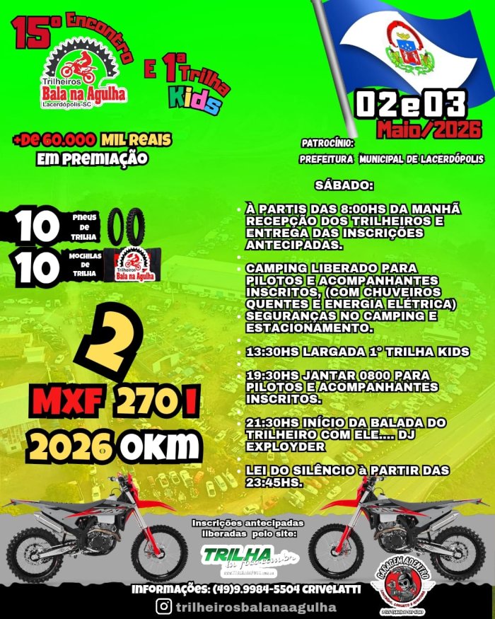 SORTEIO DE 02 MXF 270i 0KM, 10 PNEUS DE TRILHA E 15 MOCHILAS DE TRILHA ENTRE TODOS INSCRITOS NA TRILHA KIDS E TRILHÃO.
