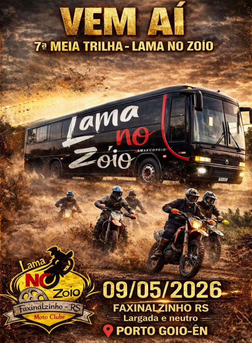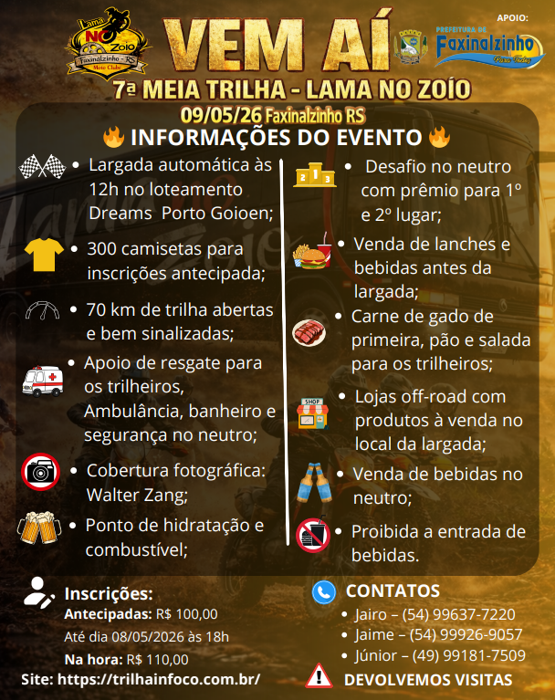 CAMISETA PARA OS PRIMEIROS 300 INSCRITOS - PRÊMIO PARA OS DOIS PRIMEIROS A SUBIREM O DESAFIO NO NEUTRO - LARGADA ÀS 12 HORAS - 70 KM DE TRILHAS - APOIO DE RESGATE - COBERTURA FOTOGRÁFICA - PONTO DE HIDRATAÇÃO E COMBUSTÍVEL - CARNE DE GADO, PÃO E SALADA PARA OS TRILHEIROS